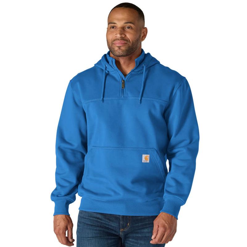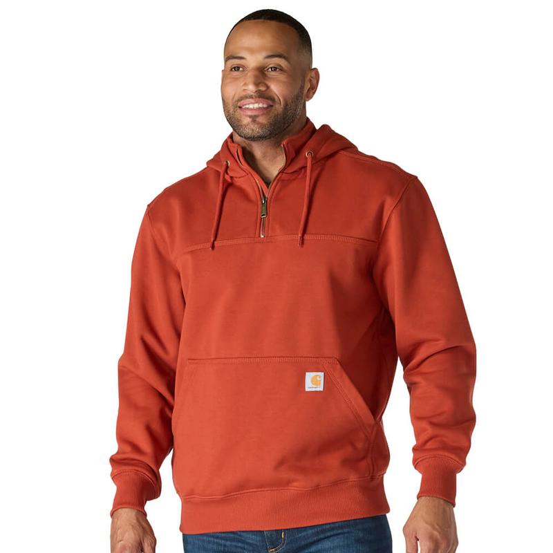 Made from durable 13-ounce, 80% cotton/20% polyester fabric, the Carhartt Hooded Zip-Mock Sweatshirt offers the warmth and durability you need. Features include a mock collar with an 8” antique brass zipper, spandex-reinforced cuff and waistband, front hand-warmer pockets, and a locker loop for easy hanging. The hood is jersey-lined and includes a sturdy draw cord to ensure the best fit.